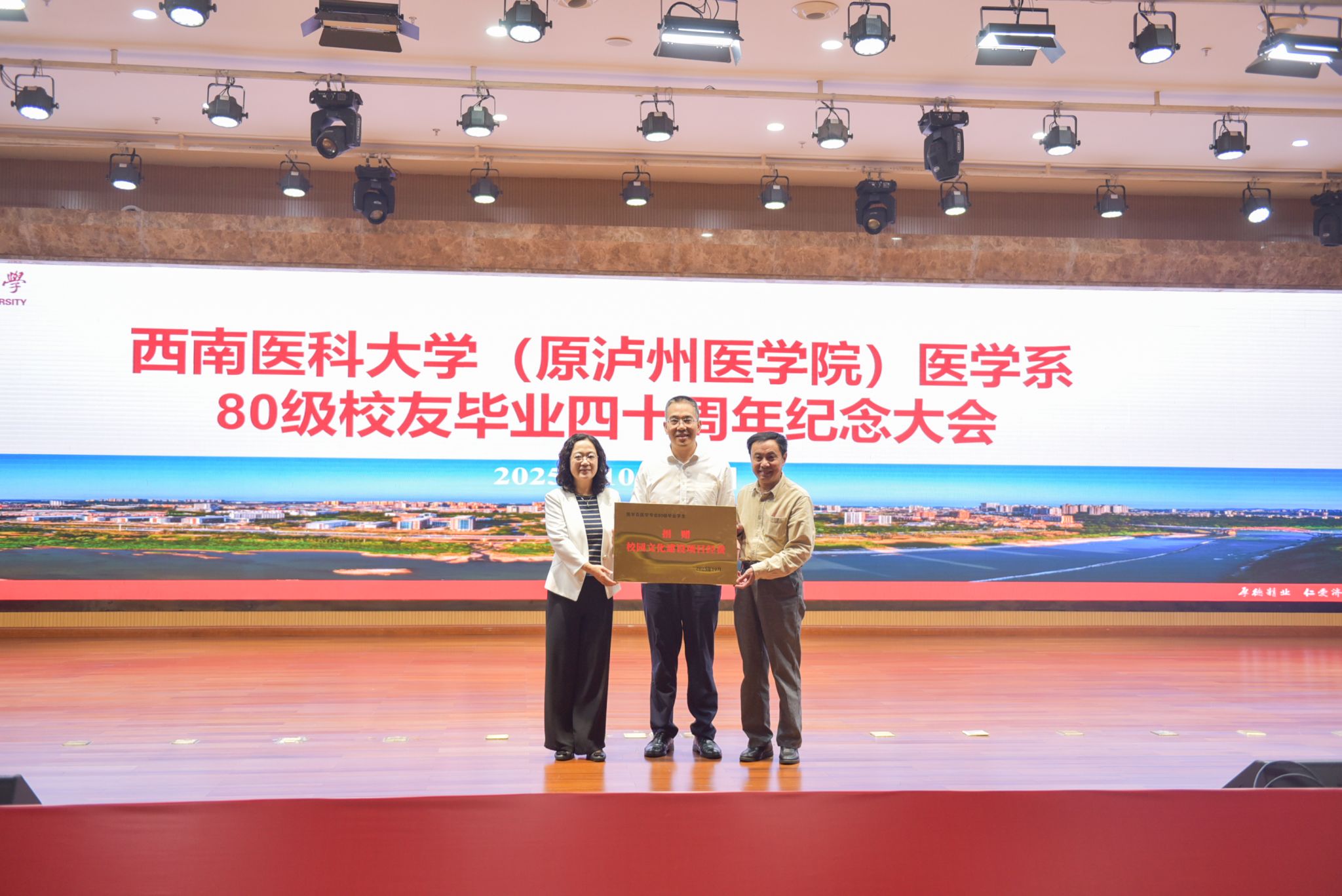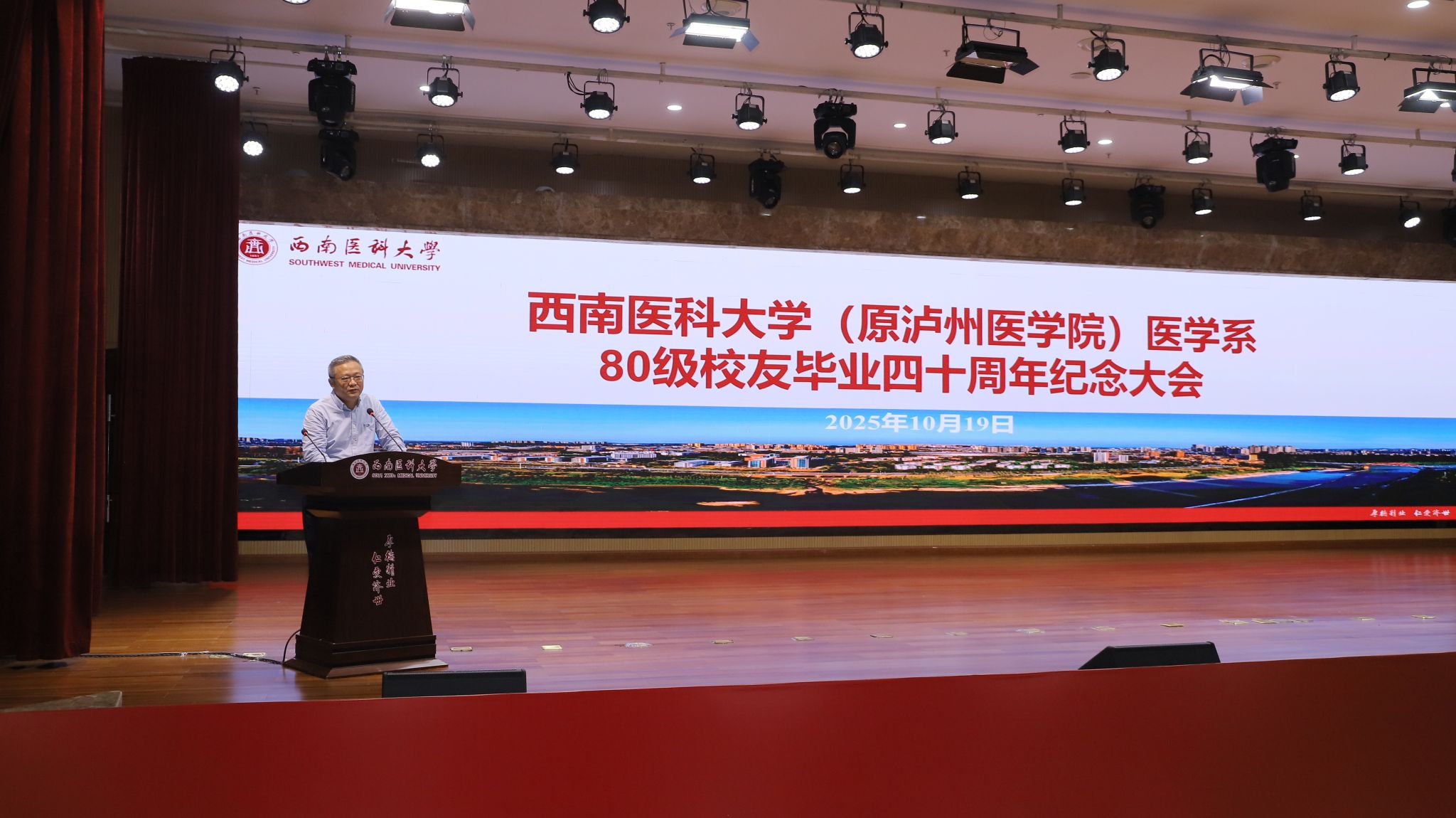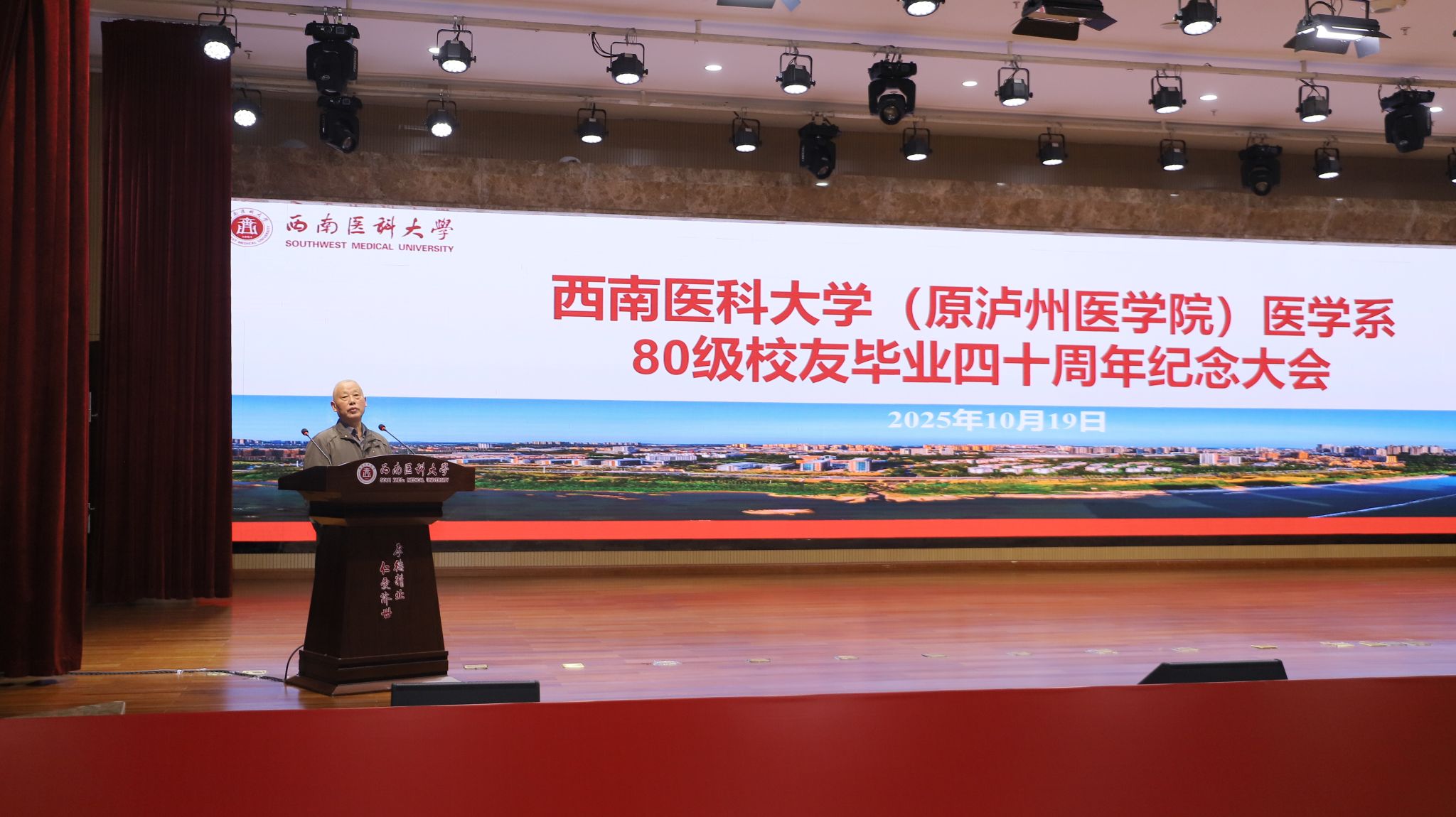 金秋送爽,丹桂飘香。2025年10月19日上午10时,西南医科大学(原泸州医学院)医学系医学专业80级校友毕业四十周年纪念大会在城北校区第一学术报告厅隆重举行。在家校领导、相关职能部门负责人与医学系80级150余名返校校友欢聚一堂,共忆青葱岁月,共话母校发展,共叙同窗情谊。