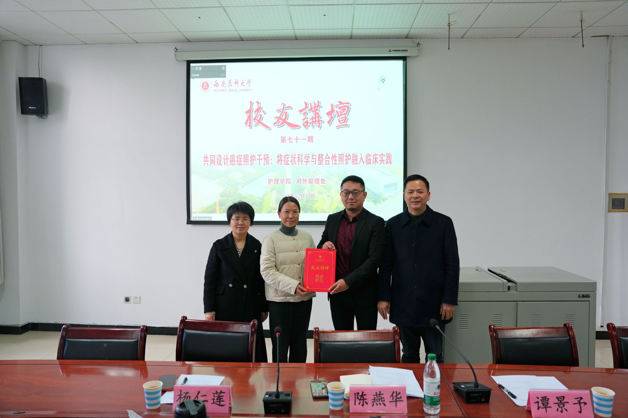 12月17日,西南医科大学第七十一期校友讲坛在城北校区海川楼会议室顺利开讲。我校护理学2006级优秀校友、澳大利亚南昆士兰大学护理与助产学院副院长、教授谭景予受邀返校,以《共同设计癌症照护干预:将症状科学与整合性照护融入临床实践》为题,为师生带来一场内容丰富的专题讲座,讲座由护理学院院长陈燕华主持。