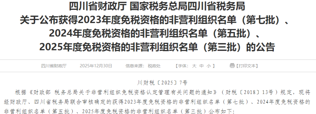 2025年12月30日,四川省财政厅、国家税务总局四川省税务局联合发布了“2025年度免税资格的非营利组织名单(第三批)的公告”,我校基金会扎实工作、精细管理,成功获批2025年度非营利组织免税资格单位,获得2025~2029未来五年的免税资格,为基金会长远发展奠定良好基础。